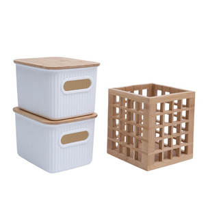 Material: Caixa de plástico com tampa de bambu; porta utensílios de bambu.